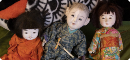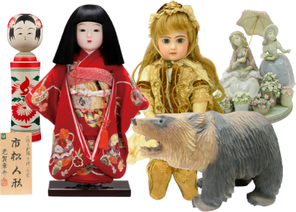 木目込人形・おやま人形・御所人形・御台人形・時代人形・文楽人形・紙塑人形(しそにんぎょう)・三つ折人形・答礼人形・京人形・賀茂人人形・ヴィンテージぬいぐるみ・箱庭人形・チャイナドール・バービー人形・テディベア・はいはい人形・さくらビスク