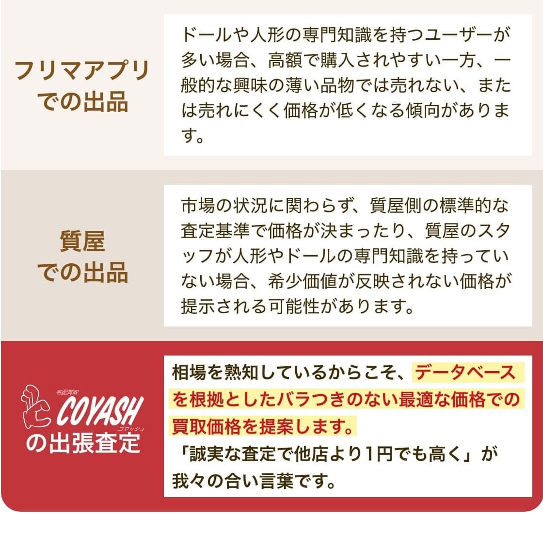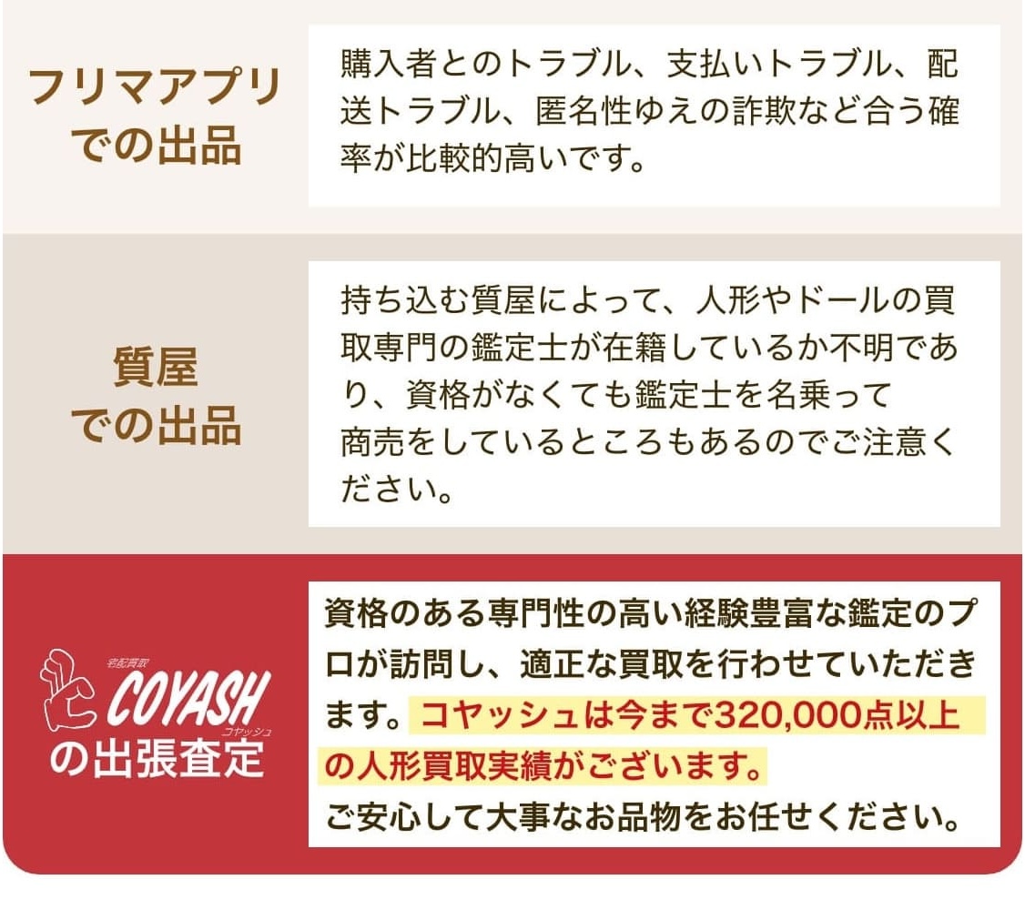 他社で見積してもらった際はサラッとドールを確認して査定額を出されてしまい納得いきませんでした。コヤッシュさんはドールを細かく確認してくださるだけでなく、査定の内容を素人にも分かるように説明してくださったので信頼できました。
