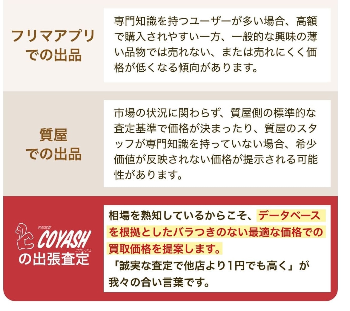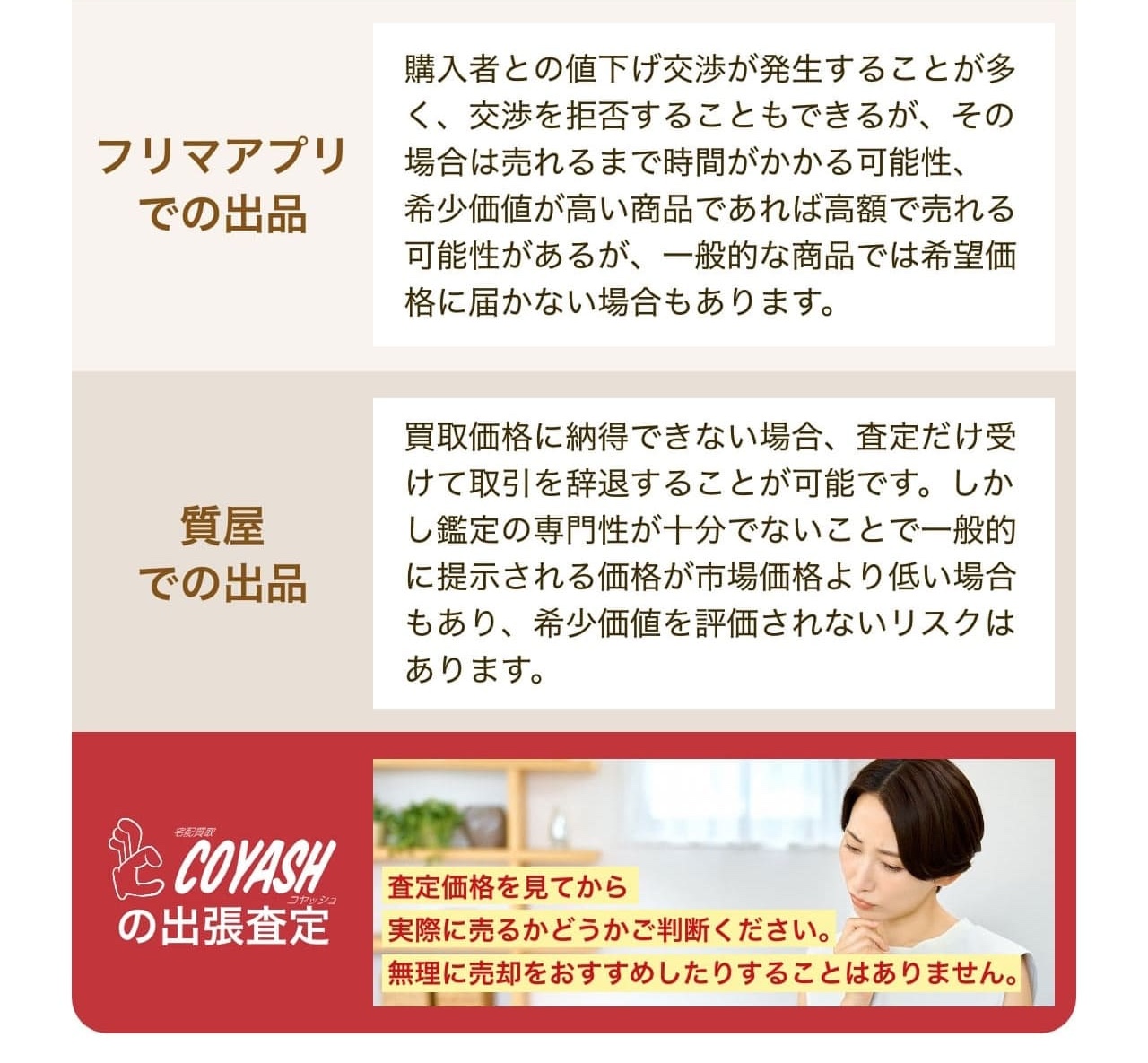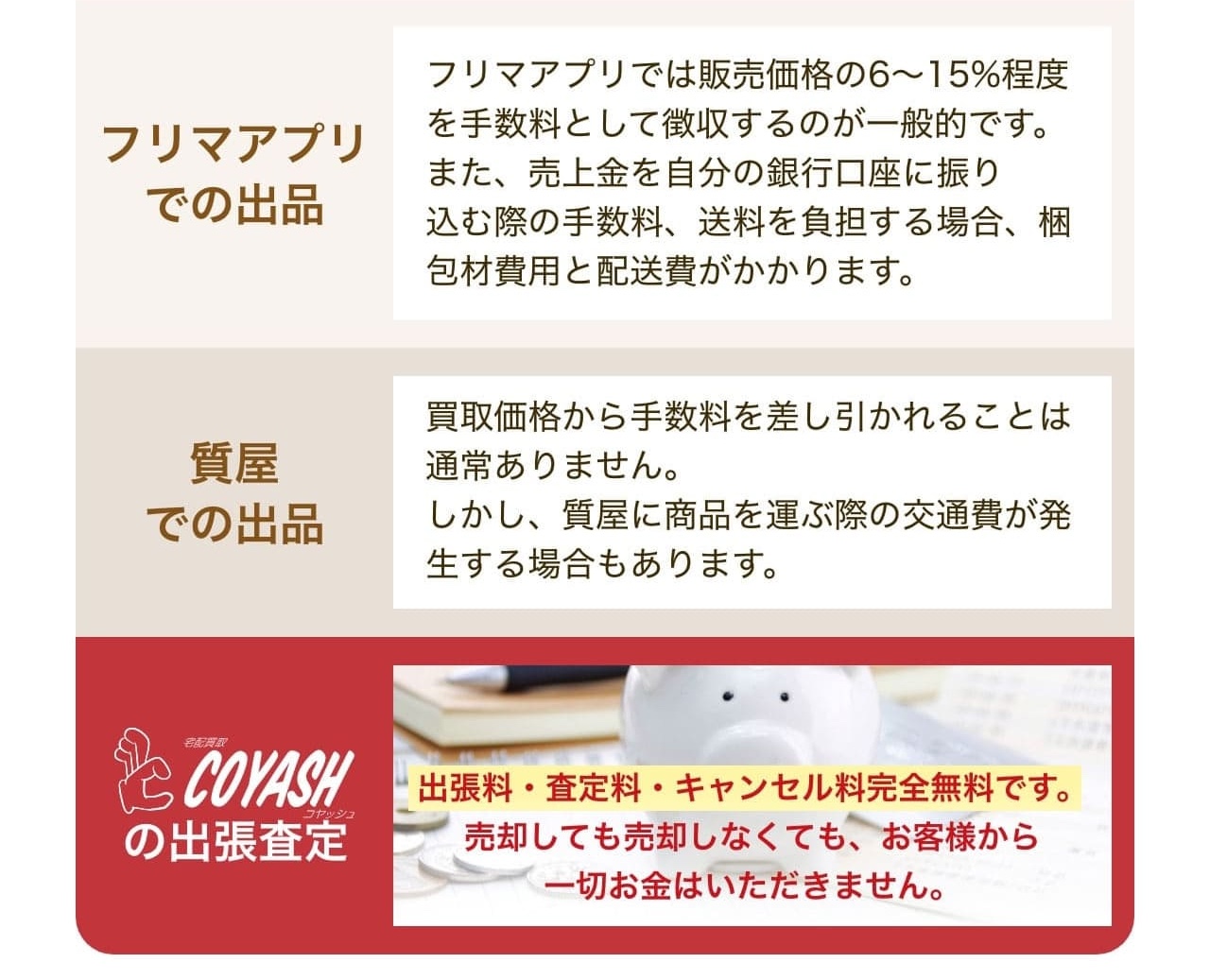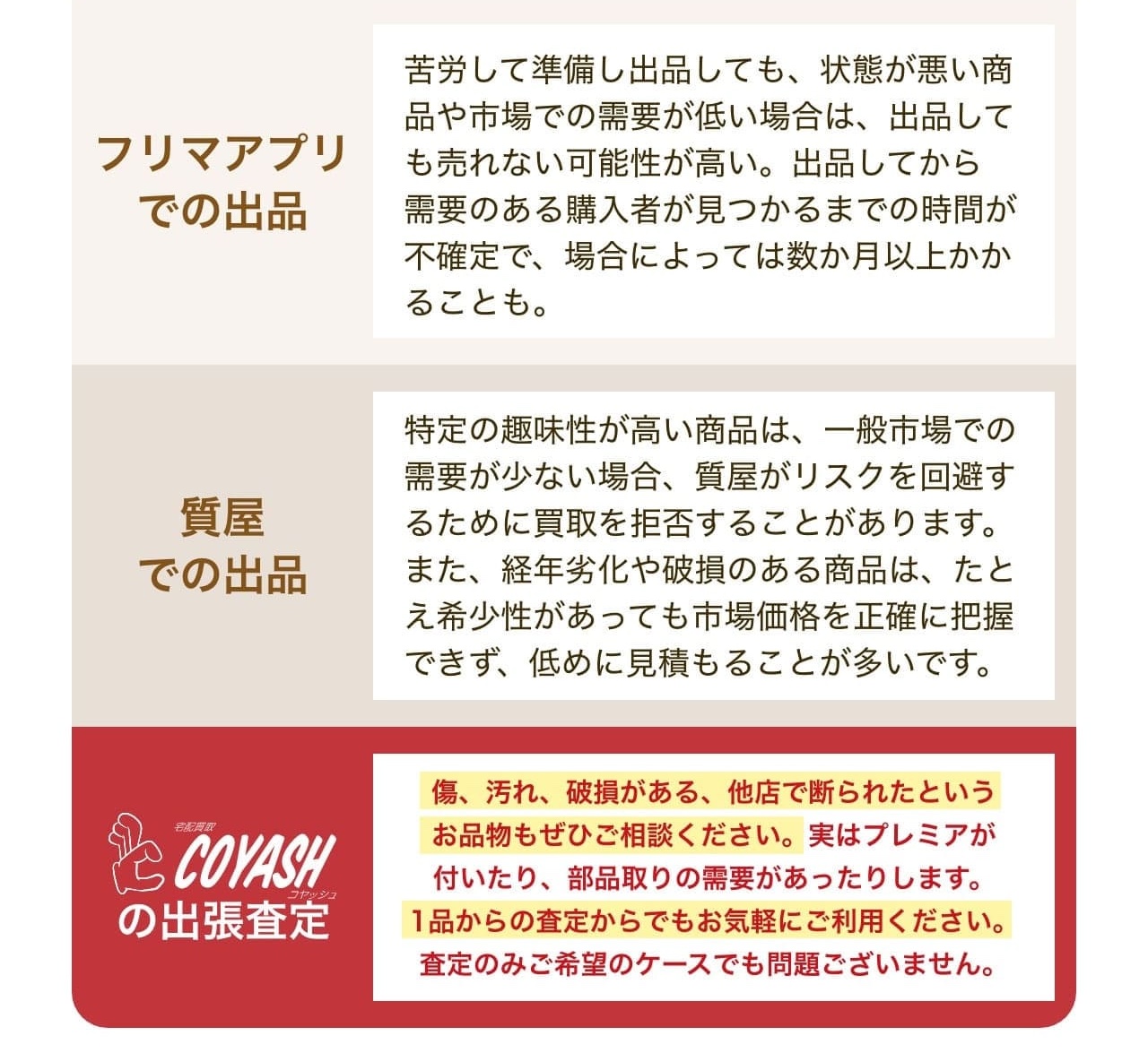 - 状態も良く比較的新しいものだったので、できるだけ高く売りたいと思いフリマアプリで出品していました。値切らないと中々売れなそうだったのであきらめてコヤッシュさんに依頼したら出品額より3000円高く買い取ってもらえました。