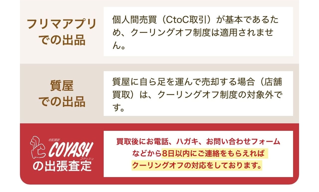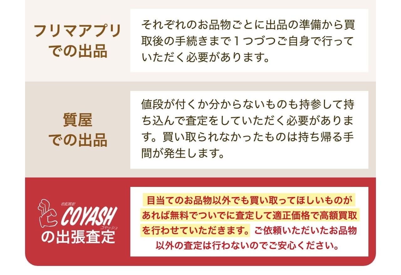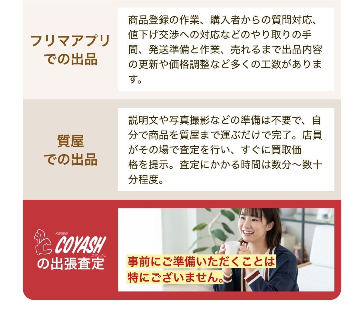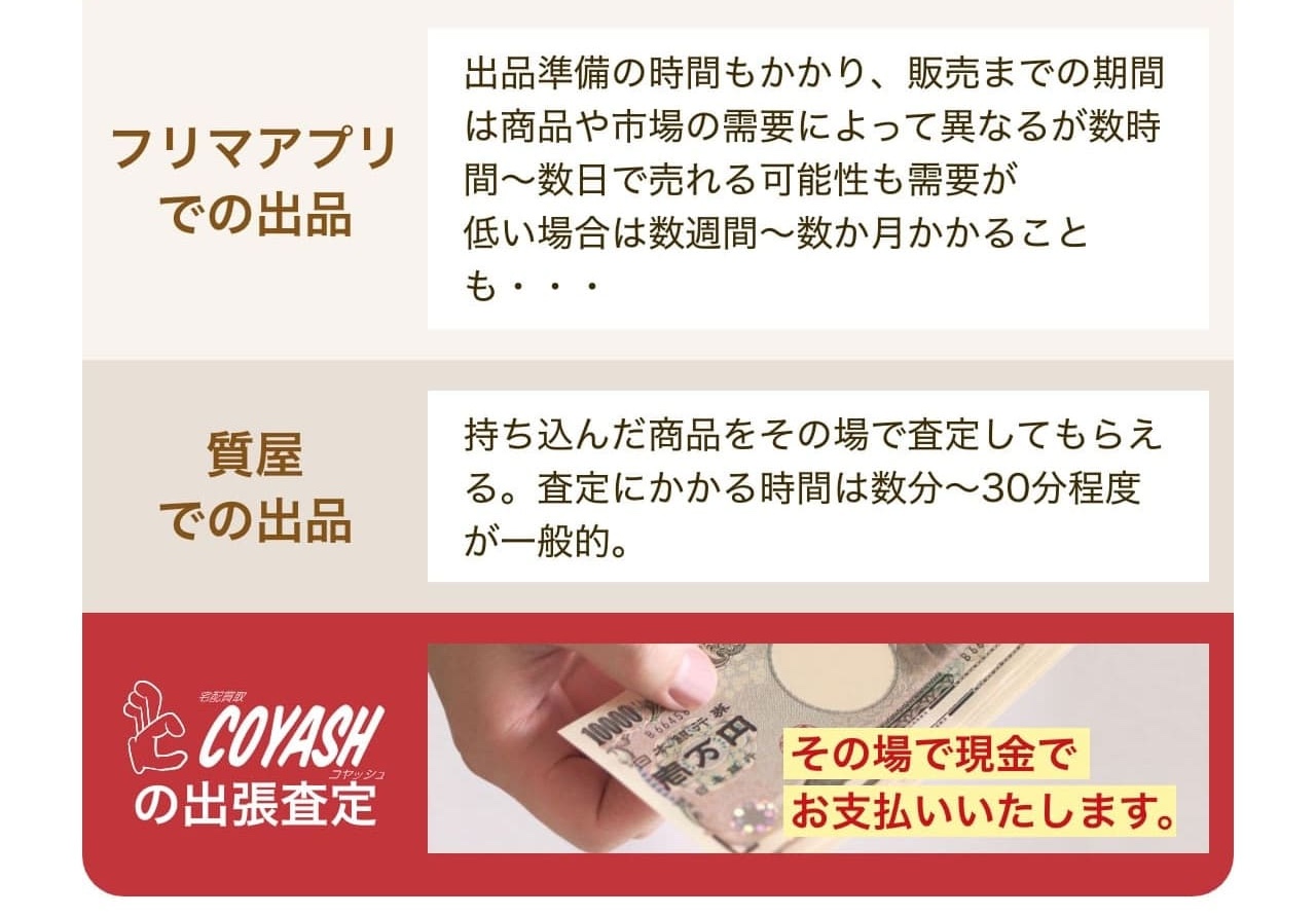 - 状態も良く比較的新しいものだったので、できるだけ高く売りたいと思いフリマアプリで出品していました。値切らないと中々売れなそうだったのであきらめてコヤッシュさんに依頼したら出品額より3000円高く買い取ってもらえました。