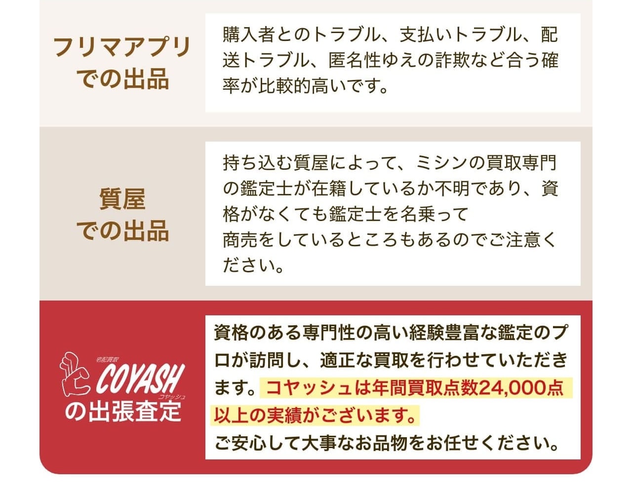 販売先を持っている - 日本製のミシンは海外人気が高くコヤッシュは海外にも販路を持っているためミシンを幅広く査定できます。