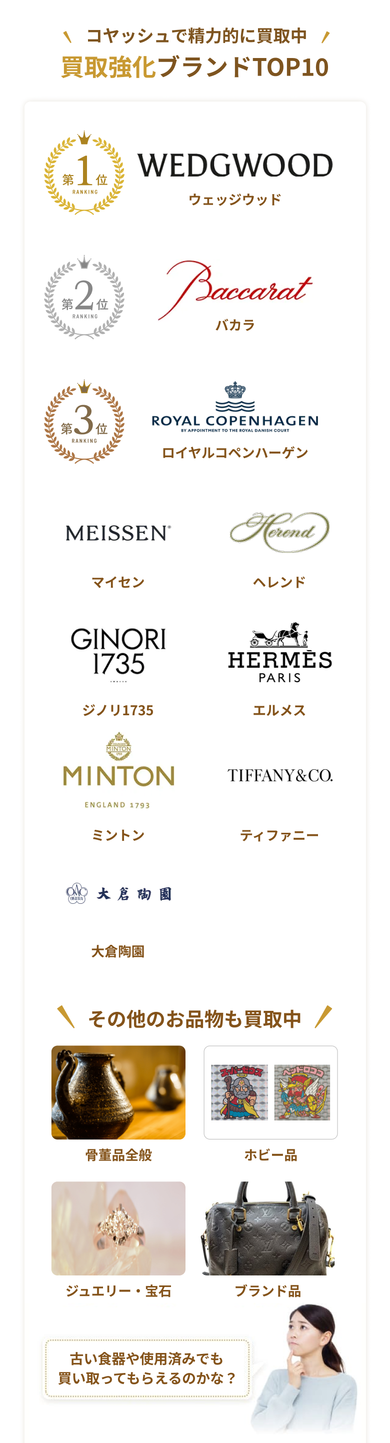豊富な販売手段と取引先をもつコヤッシュなら、他のお店では値段がつかない食器でも査定いたします! 他社では値段が付かなかった食器でも、買取のご相談をお待ちしております。